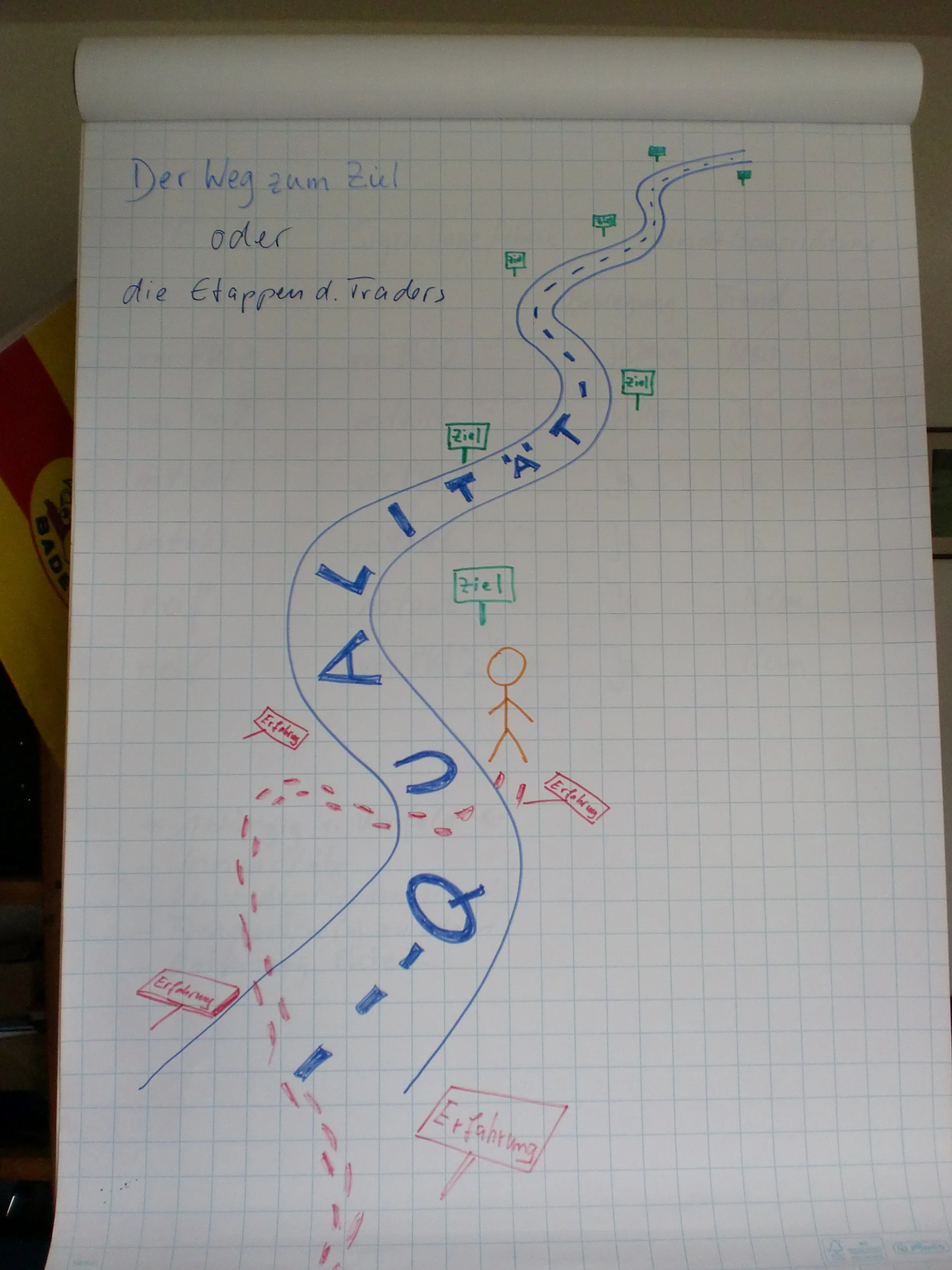 Skizze eines Weges mit Zielmarkierungen, Hinweisen für Anfänger und Fortgeschrittene, handschriftlich auf kariertem Papier in Deutsch.