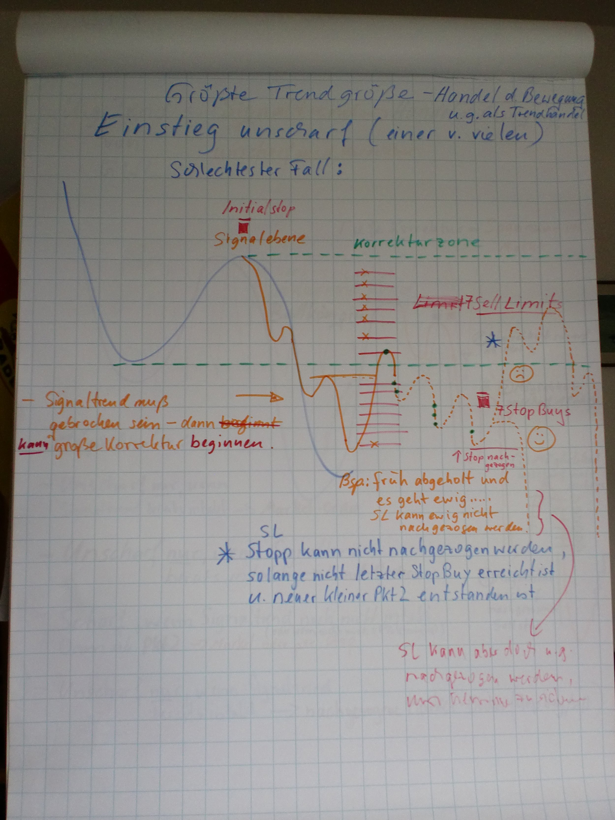 Handschriftliches Diagramm auf kariertem Papier über Trendgüssen im Handel. Es zeigt eine Grafik mit Verlauf, Signallinien, Überschriften, und Anmerkungen in verschiedenen Farben, die den Ablauf eines Handels- oder Investitionsprozesses beschreiben.